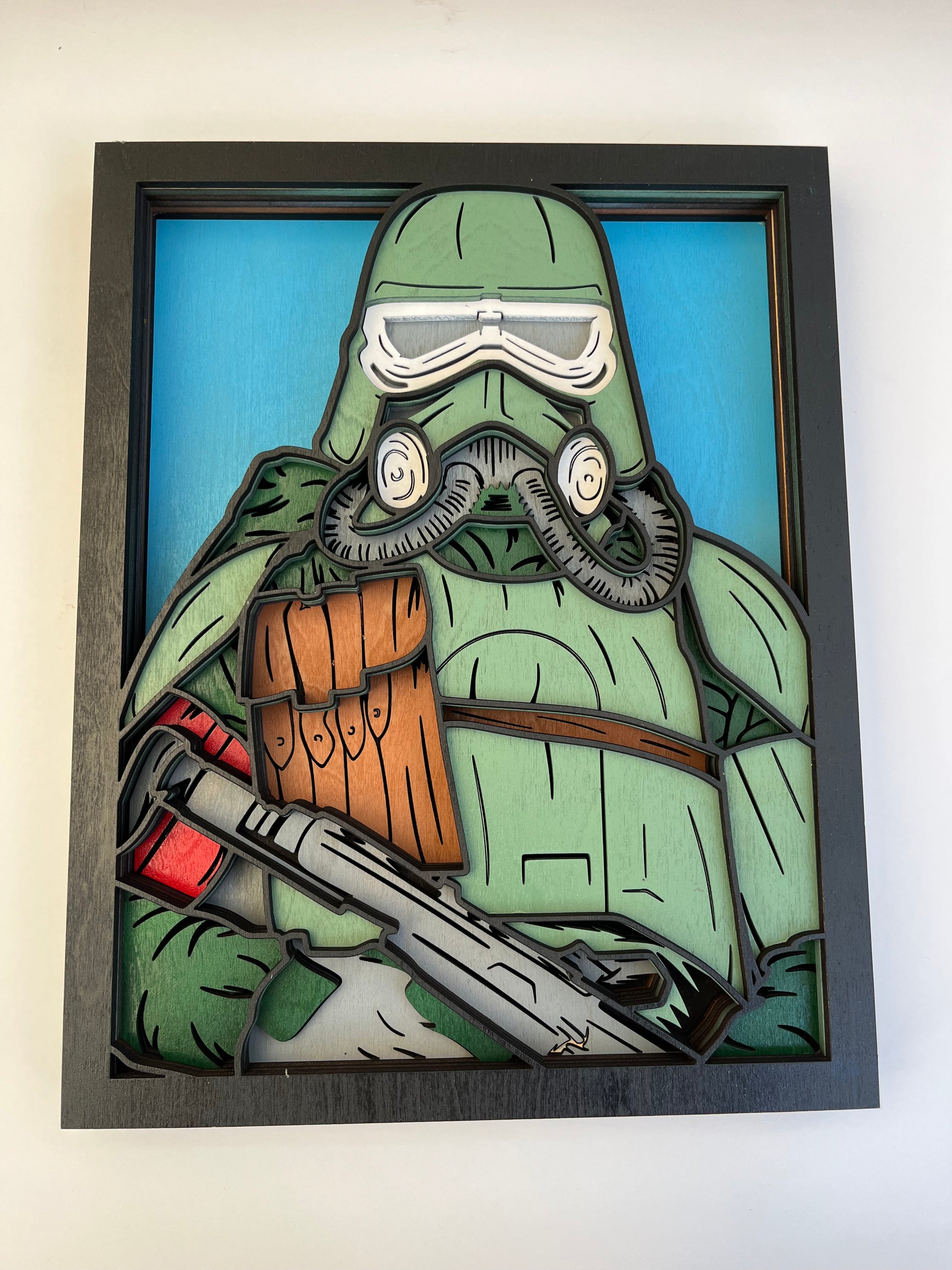 Swamp troopers, known informally as mudtroopers, were a type of Imperial Army trooper used by the Galactic Empire that existed outside the Stormtrooper Corps. This is a 3D layered wall sign decoration. It was made of 1/4 birch plywood and includes six separate hand painted layers. 11.7'x14.9"x1.5". Any custom size available per your request. Every order is processed within two business days. The colors may vary due to wood grain.