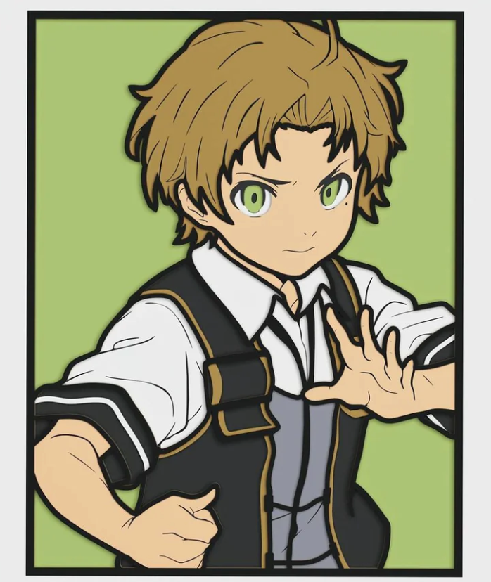 Rudeus Greyrat (ルーデウス・グレイラット Rūdeusu Gureiratto) is the main protagonist of Mushoku Tensei. He was an overweight 34-year-old Japanese NEET who is reincarnated into another world after being hit by a truck whilst saving some kids. Realizing he wasted away his previous life, he resolves to live this new one to its fullest and the series revolves around how he impacts his new world all whilst slowly growing out of his reclusive ways. Rudeus is a tall (175cm), well-built, and cool-looking man. He was born with brown hair and green eyes. However, he later has Kishirika Kishirisu switch out both of his original eyes for demon eyes, causing them to now have a slightly mismatched coloration. Like his father, Paul, Rudeus also has a mole underneath his left eye. This is a 3D layered wall sign decoration. It was made of 1/4 birch plywood and includes seven separate hand painted layers. 13'x17"x2". Any custom size available per your request. Every order is processed within two business days. The colors may vary due to wood grain.