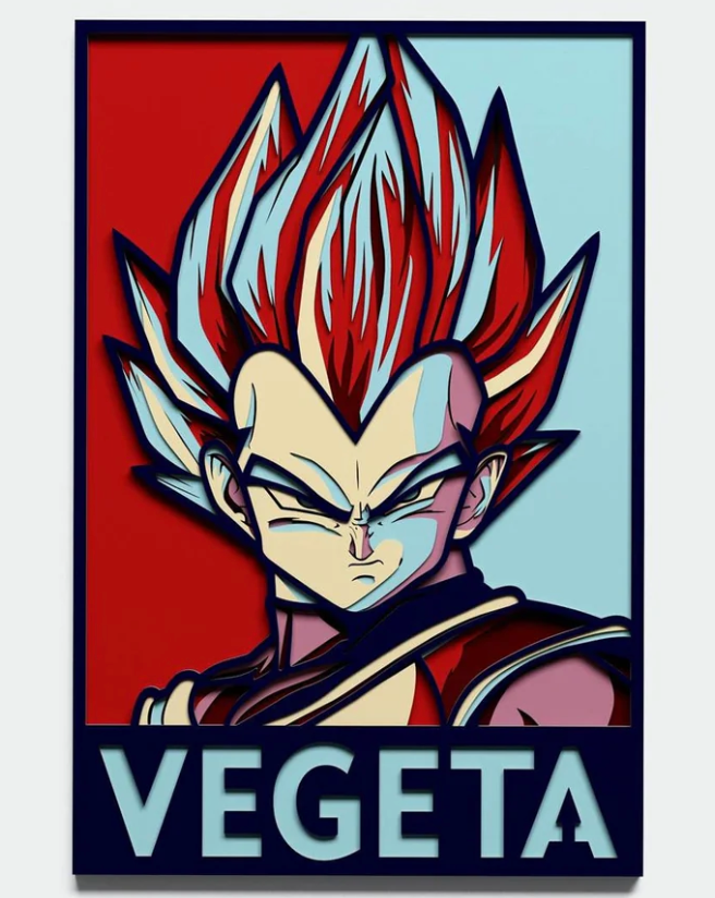 Vegeta (ベジータ Bejīta), more specifically Vegeta IV (ベジータ四世 Bejīta Yonsei), recognized as Prince Vegeta (ベジータ王子 Bejīta Ōji), is the prince of the fallen Saiyan race and the husband of Bulma, the father of Trunks and Bulla, the eldest son of King Vegeta, as well as one of the main characters of the Dragon Ball series. Regal, egotistical, and full of pride, Vegeta was once a ruthless, cold-blooded warrior and outright killer, but later abandoned his position in the Frieza Force for a peaceful life on Earth. He would repeatedly fight alongside Universe 7`s most powerful warriors in order to protect Earth and his family, as well as to surpass Goku in power. Vegeta's strong character development has received high praise and is regarded as the biggest in the series. He initially debuted as the main antagonist of the Vegeta Saga, but progressed into a more anti-heroic tritagonist role for the rest of Dragon Ball Z. Since the Majiin Buu Saga and going into Dragon Ball Super, Vegeta has been the main deuteragonist/secondary protagonist behind Goku. Vegeta is a well-built man of below-average stature, standing at 164 centimeters tall. His hair is black (or dark reddish brown, depending on the media) and spikes upwards. Vegeta has a prominent window`s peak. Like most Saiyans, he possesses defined eyes with a consistently stern look to them. Like other Universe 7 Saiyans, he was born with a prehensile, brown-furred tail, until it was permanently cut off by Yajirobe. Over the course of the series, Vegeta's physical appearance changes. While originally appearing very short and lean, especially compared to his massive partner, Nappa, he later seems to be somewhat taller and noticeably more muscular. His hair and forehead appear to be shorter and his facial features, which are perpetually in a scowl (in contrast to before he lost his first fight with Goku, when he smiled most of the time), also look more distinct and sharply defined as the series progresses, making him look much older in later sagas compared to what he looked like in his debut. This is a 3D layered wall sign decoration. It was made of 1/4 birch plywood and includes seven separate hand painted layers. 13'x17"x2". Any custom size available per your request. Every order is processed within two business days. The colors may vary due to wood grain.